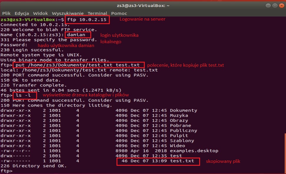 Sprawdzimy możliwość połączenia z serwerem ftp za pomocą konta damian (wcześniej utworzonego w systemie). Obecnie jestem zalogowany na konto zs3.