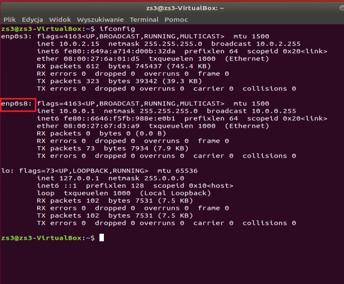 Pierwszą rzeczą, którą należy zrobić, jest przypisanie statycznego adresu IP. Jeżeli chcemy poznać ilość dostępnych interfejsów sieciowych i ich konfigurację, możemy się posłużyć polecenie: ifconfig.