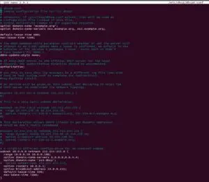 Teraz przechodzimy do konfiguracji pliku /etc/dhcp/dhcpd.conf. Są w nim opisane parametry globalne i przydzielane adresy. Jeżeli taki plik nie istnieje to należy go utworzyć oraz wprowadzić odpowiednie instrukcje. Aby plik wyedytować, wpisujemy w terminalu:
