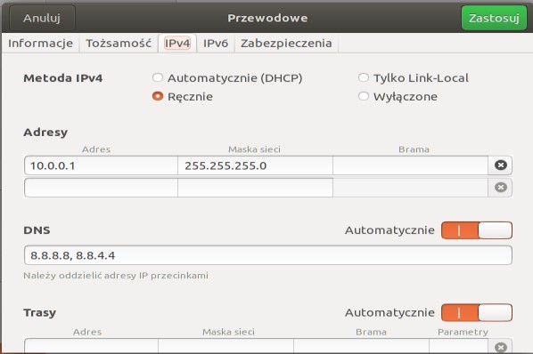 Na serwerze umieszczone są dwie karty sieciowe: jedna – pracuje w trybie NAT (pobiera internet od maszyny fizycznej), druga – jako sieć wewnętrzna (łączy serwer ze stacją roboczą). Interfejsem sieciowy sieci wewnętrznej jest enp0s8. Statyczny adres IP możemy ustawić w trybie graficznym i jego konfiguracja wygląda jak na zdjęciu poniżej. Proszę zwrócić uwagę na adresy DNS. Wykorzystałem ogólnodostępne adresy od Google: 8.8.8.8, 8.8.4.4.