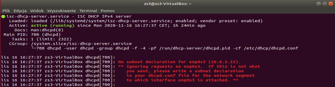 Serwer DHCP nie jest zainstalowany domyślnie. Instalujemy serwer poleceniem: