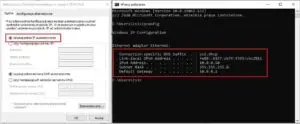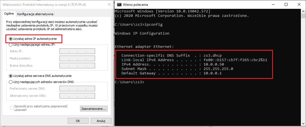 Sprawdzimy teraz, czy komputer klienta (z Windows 10) pobiera adresy z serwera DHCP. Przechodzimy do ustawień karty sieciowej klienta i ustawiamy automatyczne uzyskiwanie adresu IP. W wierszu poleceń klient, poleceniem ipconfig, sprawdzamy ustawienia.