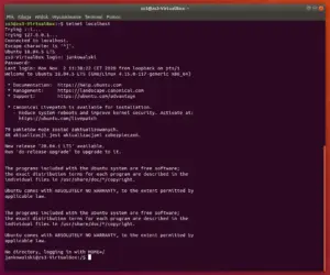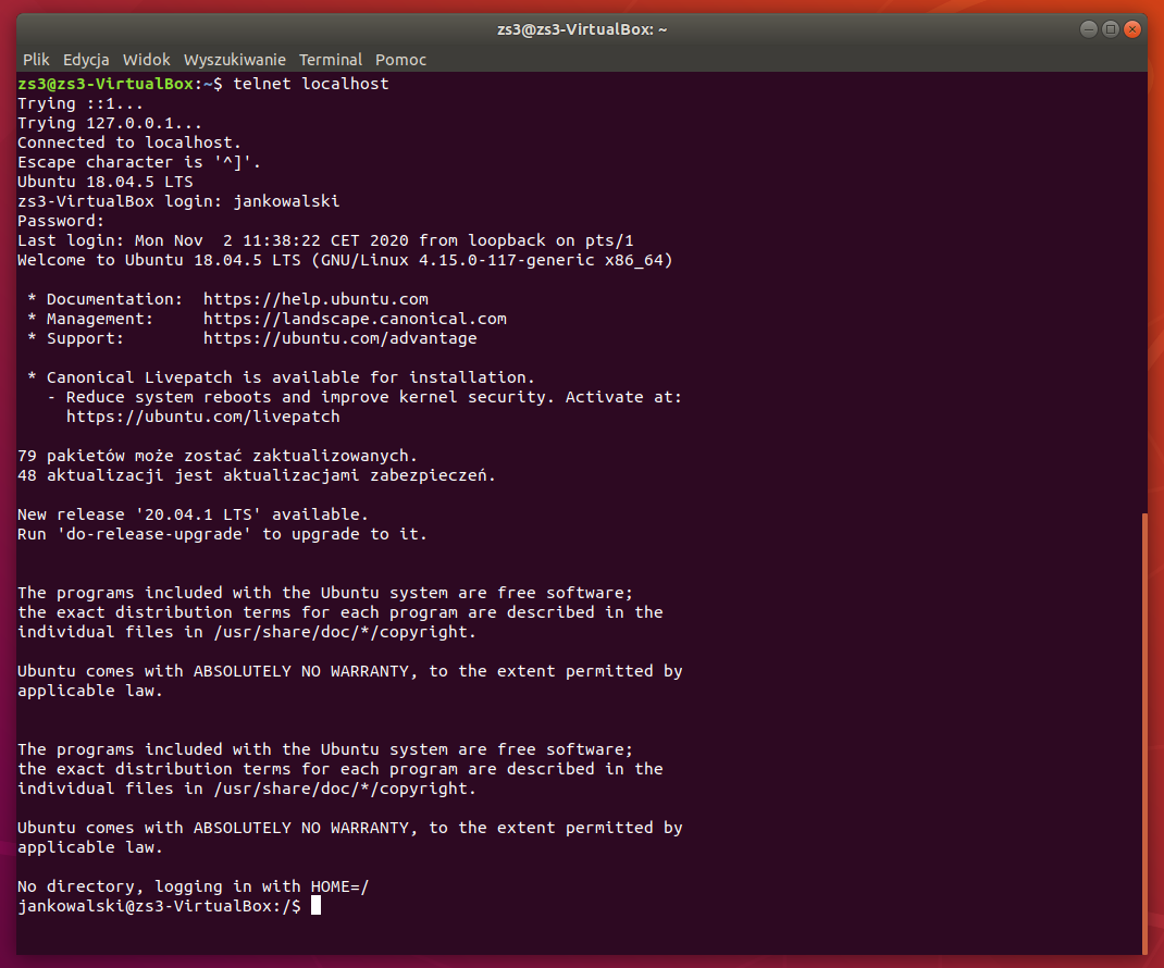 sudo /etc/init.d/openbsd-inetd restarttelnet localhostW moim przykładzie połączę się z kontem użytkownika (drugie konto w systemie) jankowalski.